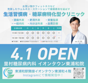今年4/1(水)、イオンタウン東浦和に【里村糖尿病内科イオンタウン東浦和院】を開院いたします。